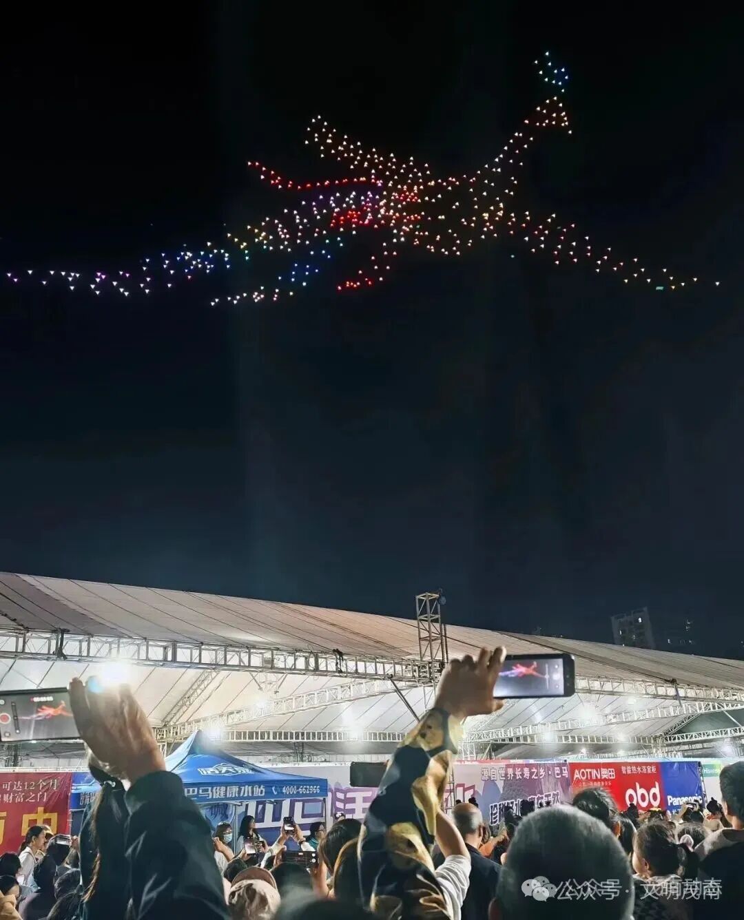 非遗韵味尚在弥漫,科技盛宴再添惊喜。数百架无人机腾空而起,依次组成嘉年华主题等创意图案,瞬间吸引全场目光,大人纷纷举起手机对准夜空拍摄,孩子们踮着脚尖、指着天幕发出阵阵惊呼。无人机群在夜色中精准列队,光影流转间变换各种图案,引得喝彩声此起彼伏,将现场氛围推向顶点。